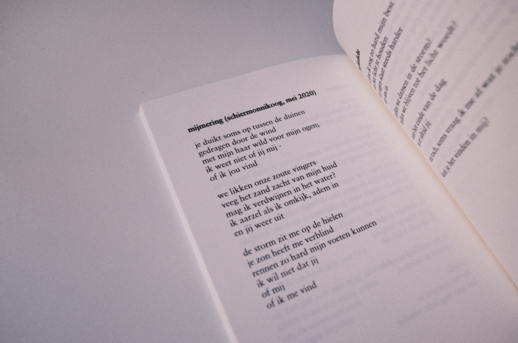 Pam: “Inspiratie komt voor mij vaak uit het lucht vallen. Soms zit ik net op de fiets, regent het zó hard maar ik móet de zinnen die in me op komen meteen opschrijven, anders vervliegen ze weer.”